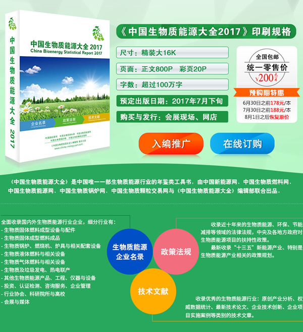 《中國(guó)生物質(zhì)能源大全》系列行業(yè)年鑒創(chuàng)刊于2015年。《中國(guó)生物質(zhì)能源大全 2017》已是第三版,秉承全書(shū)一貫以來(lái)的高質(zhì)量、大數(shù)據(jù)、時(shí)效性、實(shí)用性等特點(diǎn),全面收錄最新企業(yè)、政策、技術(shù),整合全行業(yè)數(shù)據(jù)信息,竭誠(chéng)為生物質(zhì)能源企業(yè)與業(yè)內(nèi)人士服務(wù)。
