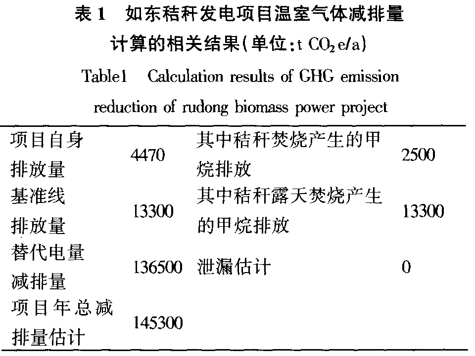 4.4泄漏 在秸稈產(chǎn)量充足的情況下,大量的秸稈由于沒有采取其他利用方式(如沼氣發(fā)電、生物質(zhì)制氣等)而直接露天焚燒,則項(xiàng)目的泄漏為零。如果由于焚燒發(fā)電項(xiàng)目影響到其他秸稈利用項(xiàng)目所需要的秸稈,則必須考慮這部分秸稈所帶來的泄漏。 5計(jì)算結(jié)果分析 根據(jù)以上分析和計(jì)算公式,結(jié)合如東生物質(zhì)發(fā)電項(xiàng)目可行性分析報(bào)告提供的數(shù)據(jù),我們得到表1所示結(jié)果。
