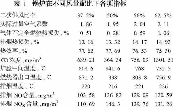 實(shí)驗(yàn)結(jié)果表明:僅有一次風(fēng)供給,燃燒效果非常不好,風(fēng)量增大,燃料層溫度增高,參與反應(yīng)的燃料增多,單位時(shí)間內(nèi)產(chǎn)生的揮發(fā)分增多,不完全燃燒損失增大。因此,僅通過改變一次風(fēng)量大小不能夠徹底改善爐膛內(nèi)燃燒不完全的狀況。 (2)經(jīng)過試驗(yàn)篩選認(rèn)為空氣供給量為16m3/h,過量空氣系數(shù)是1.95時(shí)比較好,以此為基礎(chǔ)將供給的空氣取不同的比率分為兩路供給。在不同的配風(fēng)比例下,實(shí)驗(yàn)結(jié)果如表1。