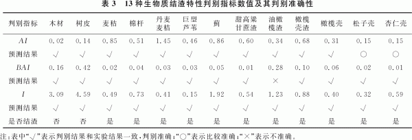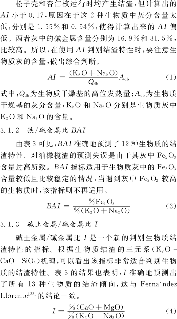 3.1.1堿性氧化物指數(shù)AI 文獻(xiàn)給出堿性氧化物指數(shù)AI作為生物質(zhì)結(jié)渣特性判別指標(biāo),即用每GJ生物質(zhì)燃料熱量含有堿性氧化物(K2O和Na2O)的量判別燃料的結(jié)渣傾向(如式(1))。由表3可以看出,13種生物質(zhì)中,AI對(duì)11種判別無(wú)誤。