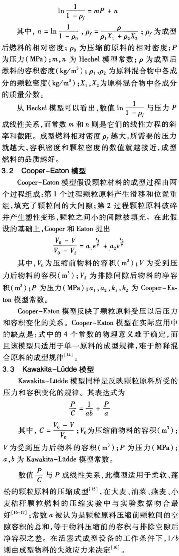3生物質成型模型介紹 顆粒原料(金屬或非金屬)在不同的壓力下表現(xiàn)出來的壓縮特性并不相同,為了更好地了解顆粒原料的成型規(guī)律,國外學者在試驗的基礎上提出一些顆粒原料固化成型模型,如Walker(1923)、Jones(1960)、Heckel(1961)、Cooper and Eaton(1962)、Kawakita andLtidde(1971)、Sonnergaard(2001)、Panelli—Filho(2001)等。這些成型模型有的是反映顆粒原料在壓縮過程中壓力和密度的變化關系,有的是反映壓力和容積的變化關系。不同的壓縮模型適用于不同壓縮物料,它們被廣泛運用于陶瓷制品、金屬材料成型、化肥、藥品和食品的研究領域。而相對于柔軟、蓬松、植物纖維含量高的生物質顆粒的成型,Heckel(1961)、Cooper—Eaton(1962)、Kawakita—Ltidde(1971)提出的3個模型能夠與實驗數(shù)據(jù)較好地吻合,所以至今仍然被廣泛運用于生物質成型規(guī)律的研究中。 3.1Heckel模型 Hechel模型是被廣泛運用于制藥和生物質成型的模型之一,反映的是顆粒原料壓縮過程中其相對密度和所受壓力之間的函數(shù)關系,其具體表達式為