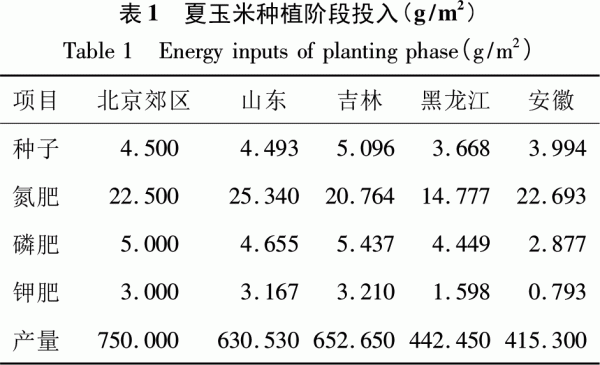 2數(shù)據(jù)來源 2.1種植階段 玉米種植能量輸入包括種子、氮肥、磷肥、鉀肥、殺蟲劑、除草劑、農(nóng)機(柴油)、電力(灌溉)[2]。各地區(qū)典型種子和化肥用量投入見表1[9,10]。