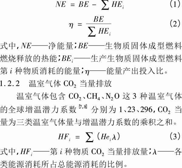 1.2評價指標 1.2.1凈能量與能量產(chǎn)出投入比 研究輸入的能源與輸出的生物質(zhì)能之間的關(guān)系,可以用凈能量或能量產(chǎn)出投入比來表示。凈能量為生物質(zhì)固體成型燃料燃燒釋放的熱能與生產(chǎn)生物質(zhì)固體成型燃料消耗的總能量之差。能量產(chǎn)出投入比為生物質(zhì)固體成型燃料燃燒釋放的熱能與生產(chǎn)生物質(zhì)固體成型燃料消耗的總能量之比: