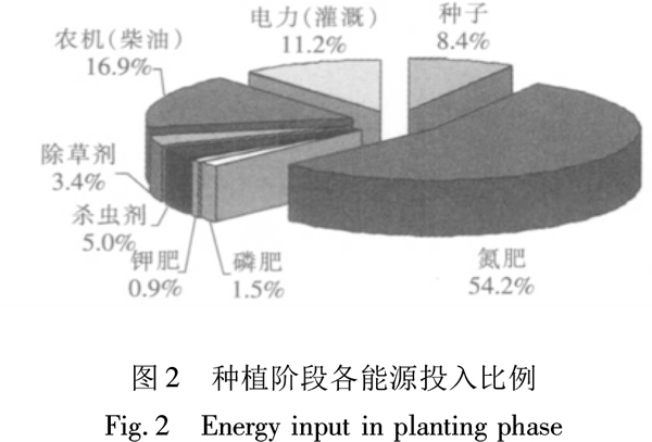 我國年秸稈用于能源和廢棄總量占總秸稈量的43%[19],大興區(qū)土地面積1031km2,其中玉米種植面積25000m2,玉米種植面積占全區(qū)的比例為24%,設(shè)大興周邊地區(qū)的玉米種植面積與大興區(qū)種植情況一致。玉米秸稈單位產(chǎn)量為0.90kg/m2,年秸稈需要量12000t,由公式(4)可計算出原料的收集半徑為65.6km。 2.3生物質(zhì)固體成型燃料加工階段 生物質(zhì)固體成型燃料加工階段,采用生產(chǎn)率較高的環(huán)模式成型機[20],工藝路線包括原料粉碎、細粉、輸送、除塵、成型、冷卻、包裝等工序,分為壓塊和制粒兩條,其中壓塊只進行一次粉碎即可成型,省略了細粉工序。本模型計算假設(shè)制粒和壓塊各生產(chǎn)5000t生物質(zhì)固體成型燃料,生物質(zhì)固體成型燃料加工主要消耗電力能源,制粒消耗93.375kWh/t,壓塊消耗86kWh/t,數(shù)據(jù)來源于生物質(zhì)固體成型燃料廠。 單位電力投入的能源及碳排放參照文獻[21~25],電力投入各能源比例參考中國統(tǒng)計年鑒。本階段包含燃料廠到生產(chǎn)車間轉(zhuǎn)運過程的能量,此過程運輸?shù)钠骄嚯x設(shè)為1km,采用叉車,柴油的能量強度為38.72MJ/L,耗油量0.05L/(t·km)[17]。 2.4生物質(zhì)固體成型燃料運輸階段 生物質(zhì)固體成型燃料運輸一般采用四輪柴油貨車,柴油的能量強度為38.72MJ/L,耗油量為0.05L/(t·km)[17],設(shè)運輸?shù)钠骄嚯x為30km。 2.5生物質(zhì)固體成型燃料使用階段 大興生物質(zhì)固體成型燃料主要供溫室大棚使用,使用時間為2400h,采用生物質(zhì)鍋爐供暖,其單位用量10.4kg/h,1萬t生物質(zhì)固體成型燃料可供400個溫室大棚使用(數(shù)據(jù)來源于大興溫室大棚用戶)。生物質(zhì)固體成型燃料燃燒消耗部分電能,溫室大棚鍋爐電機有效功率為20W(數(shù)據(jù)來源于北京生物質(zhì)鍋爐廠家)。生物質(zhì)固體成型燃料燃燒排放為零,即作物光合作用吸收的物質(zhì)的量等于燃燒所排放的物質(zhì)的量。 3結(jié)果與分析 3.1能量投入 3.1.1種植階段 種植階段主要產(chǎn)出玉米和玉米秸稈,經(jīng)模型計算,該階段的總能耗為2.3867MJ/m2,玉米秸稈占玉米種植總能量的30%,即分配后玉米秸稈的能量輸入為0.7160MJ/m2。種植階段主要能量投入排在前三位,依次為氮肥、農(nóng)機油耗、灌溉電力,分別占54.2%、16.9%、11.2%(見圖2)。可見合理施用氮肥對能量輸入有重要影響,可以大大減少一次能源的使用量。因此大力推廣中耕或免耕技術(shù)和節(jié)水灌溉技術(shù)可大大減少玉米種植的能量投入,以降低生產(chǎn)生物質(zhì)固體成型燃料的能耗。
