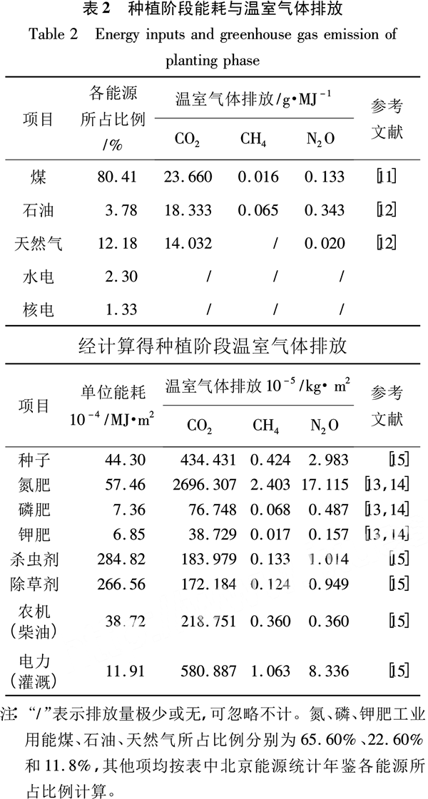 由表1可見,不同地區(qū)的用量存在差異。本研究采用北京郊區(qū)數(shù)據(jù)進行計算。該地區(qū)主要為“冬小麥-夏玉米”輪作方式。夏玉米生育期短、生長發(fā)育快、需肥多,尤其是對N、P、K的吸收。N肥采用尿素,折合成N用量約為22.5g/m2,磷肥折成P2O5用量約為5.0g/m2,鉀肥約為3.0g/m2。除草劑采用防治效果較好的50%乳油,在玉米播種后出苗前使用,施用量為0.3mL/m2,加水750L后噴霧除草。殺蟲劑采用2.5%敵百蟲粉,施用量為0.75g/m2[9]。 農(nóng)機包括播種機、收割機、脫粒機及打捆機,均使用柴油動力,其耗油量總估算值為10.5mL/m2。電力主要是水泵灌溉,北京市玉米種植約9065.76萬m2,灌溉用水均為地下水,用水量約1300萬m3,水泵采用TOP40-4型,電機功率6.3kW,效率為40m3/h,則用電量約為0.0225kWh/m2[10]。溫室氣體排放計算詳見表2。