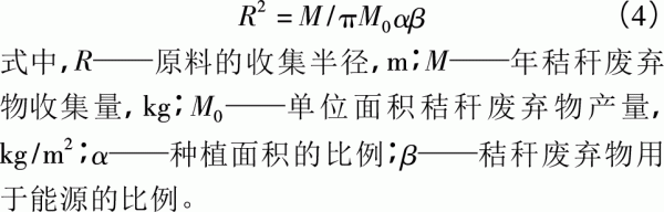 該階段主要產(chǎn)出玉米和玉米秸稈,產(chǎn)量數(shù)據(jù)來源于北京市大興區(qū)農(nóng)戶,按照每平方米產(chǎn)0.75kg玉米,單位能量為44.3MJ/kg[9],9000kg玉米秸稈,單位能量為14.6MJ/kg計算。本文主要考慮玉米秸稈的利用產(chǎn)生的能耗和溫室氣體排放,因此,采用能量分配法分配種植階段的投入能量,即每萬平方米產(chǎn)出的玉米秸稈能量占玉米種植總能量的30%。 2.2秸稈原料運輸階段 秸稈到燃料廠的運輸階段,玉米秸稈加工的損耗率約16.67%,即1萬t生物質(zhì)固體成型燃料需要1.2萬t秸稈。秸稈收集方式采用農(nóng)民分散送廠和加工廠直接收集兩種,秸稈運輸主要用農(nóng)用柴油車,柴油的能量強度為38.72MJ/L[15],耗油量0.056L/(t·km)[16,17]。 運輸距離采用收集半徑模型計算。原料的收集半徑中,資源收集量=收集面積×單位面積耕地廢棄物產(chǎn)出的秸稈量×耕地面積占區(qū)域面積的比例×秸稈用于能源的比例[18]??傻迷系氖占霃接嬎隳P蜑椋?/p>