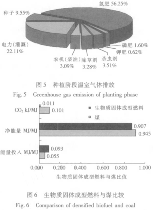 4結(jié)論 1)基于生命周期清單分析原理,利用BSAS系統(tǒng),建立評價模型,定量分析了生物質(zhì)固體成型燃料從種植到燃燒整個生命周期的能源投入和溫室氣體排放。以北京市的玉米秸稈生產(chǎn)生物質(zhì)固體成型燃料為例,對其進行能量平衡分析,凈能量為13243.5MJ/t,能量產(chǎn)出投入比為10.8,產(chǎn)出大于投入,且能源轉(zhuǎn)化效率較高; 2)生物質(zhì)固體成型燃料全生命周期種植階段的耗能最大,其中氮肥、機械耗油、灌溉電力是影響該過程能源消耗的主要因素。種植階段對全球變暖潛力的影響最大,占整個生命周期指標的58.8%,其中氮肥的溫室氣體排放量占種植階段的總排放量的56.25%。如何降低氮肥用量是減少生物質(zhì)固體成型燃料能耗與溫室氣體排放的最關(guān)鍵因素; 3)生物質(zhì)固體成型燃料的加工階段的能耗其次,占總能耗的24.23%,排放的溫室氣體占總排放的24.5%。因此,如何降低成型過程的電耗是影響生物質(zhì)固體成型燃料的能耗和溫室氣體排放的關(guān)鍵因素之二; 4)與煤相比,生物質(zhì)固體成型燃料的溫室氣體排放量不到煤的1/9,能源環(huán)境效益巨大 |