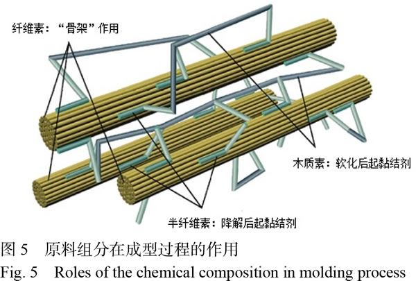 3.2木質(zhì)素黏結(jié)作用 成型過程中,木質(zhì)素發(fā)生熱轉(zhuǎn)變后起黏結(jié)固化和填充作用,是生物質(zhì)自身起黏結(jié)作用的主要成分[17-18]。在70~110℃時(shí),木質(zhì)素開始軟化,具有一定黏度,在200~300℃時(shí),呈現(xiàn)熔融狀態(tài),黏度變大。此時(shí),在一定壓力下,與原料中的纖維素、半纖維素等通過分子間互相吸引和纏繞黏結(jié)成型[19-20]。 3.3木質(zhì)素結(jié)構(gòu) STELTE等[9]認(rèn)為,羥基特別是酚羥基易形成豐富的氫鍵結(jié)構(gòu),有利于促進(jìn)黏結(jié)成型,增大顆粒機(jī)械強(qiáng)度。桉木屑和硬雜木屑木質(zhì)素含量相差不大(依美國(guó)可再生能源實(shí)驗(yàn)室數(shù)據(jù)庫(kù),桉木屑含木質(zhì)素26.91%~28.16%,硬雜木屑含木質(zhì)素23.87%~28.55%),但實(shí)際桉木屑成型能耗高、成型后密度和強(qiáng)度低。這可能是因?yàn)殍衲拘寄举|(zhì)素以紫丁香基結(jié)構(gòu)單元為主,硬雜木屑木質(zhì)素以愈創(chuàng)木基結(jié)構(gòu)單元為主[21],紫丁香基結(jié)構(gòu)單元木質(zhì)素黏結(jié)指數(shù)低于愈創(chuàng)木基結(jié)構(gòu)單元,成型效果有較大差異[13]。 4原料化學(xué)組分 生物質(zhì)結(jié)構(gòu)復(fù)雜,包含纖維素、半纖維素和木質(zhì)素,還有抽提物和和灰分等[22-23]。不同組分在成型過程中的作用不同,見圖5。不同類型生物質(zhì)組分和結(jié)構(gòu)不同,成型難易及效果有較大差異[24]。