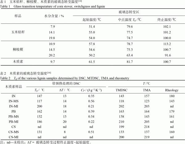 3木質(zhì)素黏結(jié)作用 3.1熱轉(zhuǎn)變特性 生物質(zhì)是一種天然高分子聚合物,其熱轉(zhuǎn)變特性指玻璃態(tài)轉(zhuǎn)變溫度(Tg)和熔融溫度。玻璃態(tài)轉(zhuǎn)變溫度是指聚合物軟化,從玻璃態(tài)向塑性態(tài)轉(zhuǎn)變的溫度。聚合物由分子量和鏈長(zhǎng)不同的結(jié)構(gòu)單體組成,玻璃態(tài)轉(zhuǎn)變發(fā)生在一個(gè)溫度區(qū)間內(nèi),是聚合物的一種重要特性。熔融溫度是指聚合物由固態(tài)向液態(tài)轉(zhuǎn)變的溫度。木質(zhì)素的熱轉(zhuǎn)變特性在成型過程中起關(guān)鍵作用。在玻璃態(tài)轉(zhuǎn)變溫度以下,由于價(jià)鍵和次價(jià)鍵所形成的內(nèi)聚力,表現(xiàn)出較高的力學(xué)強(qiáng)度,有較大的彈性模量;在玻璃態(tài)轉(zhuǎn)變溫度以上,木質(zhì)素分子部分轉(zhuǎn)動(dòng)或位移逐漸變成分子的熱膨脹運(yùn)動(dòng),流動(dòng)性增強(qiáng),有較大的黏度[9]。木質(zhì)素的玻璃態(tài)轉(zhuǎn)變溫度取決于其來源,與種類、水分含量、提取過程有關(guān)[10-11]。STELTE等[12]的研究表明,硬木木質(zhì)素存在較多乙酰基、甲氧基結(jié)構(gòu)和少量的酚羥基結(jié)構(gòu),其玻璃態(tài)轉(zhuǎn)變溫度低于軟木[12]。STELTE等[13]研究了小麥秸稈玻璃態(tài)轉(zhuǎn)變溫度對(duì)成型顆粒的影響。水分含量為8%時(shí),小麥秸稈和經(jīng)正己烷提取后的小麥秸稈的玻璃態(tài)轉(zhuǎn)變溫度分別為53℃和63℃,在玻璃態(tài)轉(zhuǎn)變溫度以下(30℃)與以上(100℃)比較時(shí),顆粒密度和強(qiáng)度較低,軸向延伸較大。 KALIYAN等[14]采用差示掃描量熱法(DSC)測(cè)定了不同水分下玉米秸稈和柳枝稷的玻璃態(tài)轉(zhuǎn)變溫度,結(jié)果見表1,發(fā)現(xiàn)水分增加會(huì)使玻璃態(tài)轉(zhuǎn)變溫度降低,因?yàn)樗帜艹洚?dāng)塑性劑,木質(zhì)素–木質(zhì)素分子間的氫鍵聯(lián)結(jié)部分被木質(zhì)素–水聯(lián)接所代替。LI等[15]采用DSC、調(diào)制溫度差示掃描量熱法(TMDSC)、熱機(jī)械法(TMA)和流變儀法(Rheology)測(cè)試了三種工業(yè)木質(zhì)素的玻璃態(tài)轉(zhuǎn)變溫度。采用DSC測(cè)試時(shí),發(fā)現(xiàn)直接對(duì)樣品進(jìn)行程序升溫,DSC曲線會(huì)因水分的蒸發(fā)而出現(xiàn)較寬的吸熱峰,造成較大誤差,如圖4所示。因此,必須對(duì)樣品進(jìn)行預(yù)熱處理以蒸發(fā)掉水分同時(shí)消除預(yù)熱歷史,而木質(zhì)素組分對(duì)溫度較為敏感,進(jìn)行預(yù)熱處理時(shí)溫度達(dá)到120℃時(shí)會(huì)帶來熱分解,造成結(jié)構(gòu)的改變[16]。故將預(yù)熱處理的終止溫度設(shè)定為90℃,結(jié)果如表2所示。發(fā)現(xiàn)相比于原始木質(zhì)素和甲醇不溶性成分(MI),甲醇可溶性木質(zhì)素(MS)中含有較少的縮合結(jié)構(gòu),具有較低的玻璃態(tài)轉(zhuǎn)變溫度。